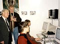Куратор от межрегиональной общественной организации «Открытая Россия», финансирующей проект, Владимир Николаевич Пиков в окружении журналистов наблюдает за тем, как непринужденно работают за компьютером читатели сельской библиотеки. |